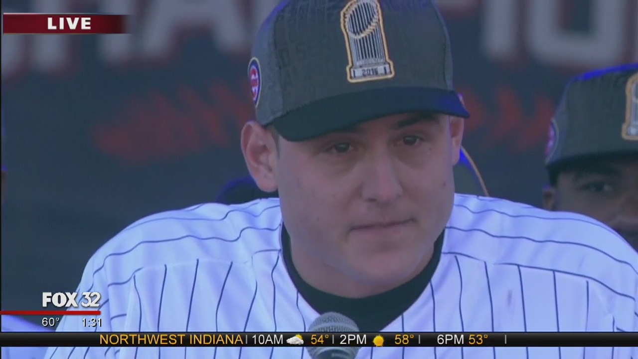 Chicago Cubs first baseman Anthony Rizzo got teary-eyed while speaking at the team's World Series championship rally.