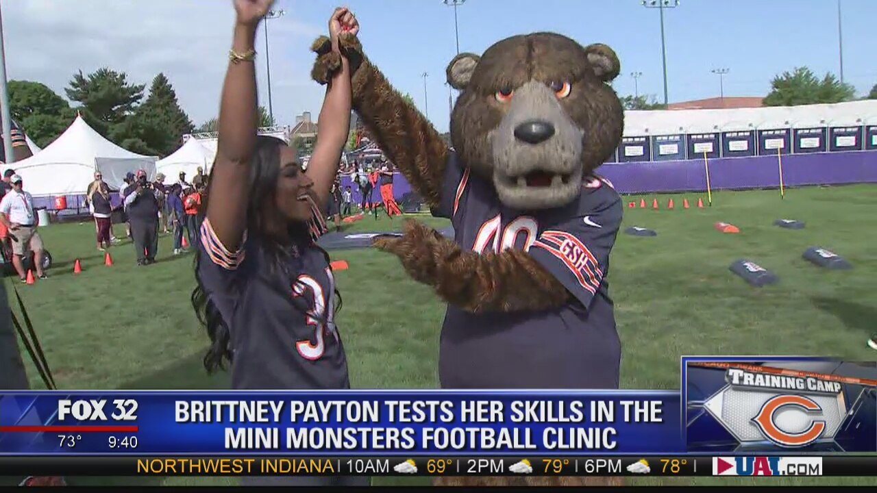 FOX 32's Brittney Payton runs through the intimidatingly fun gauntlet of the Mini Monsters Clinic at the Chicago Bears training camp in Bourbonnais.
