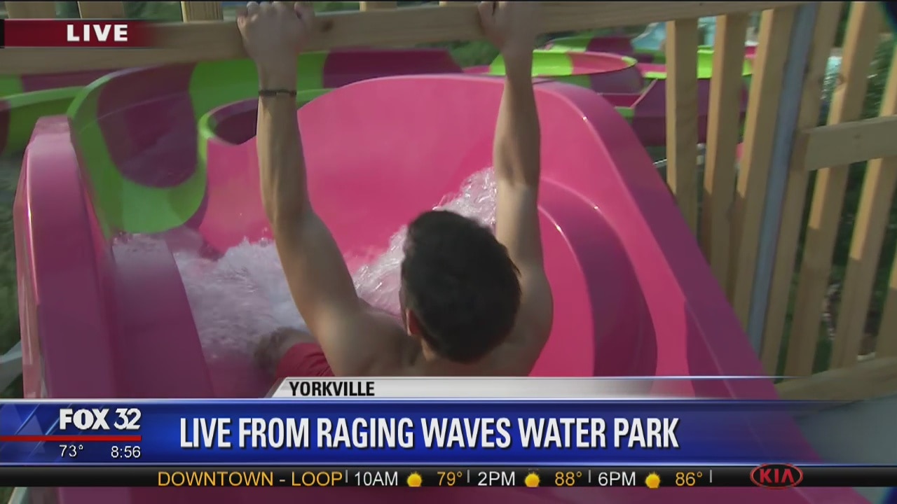 FOX 32's Anthony Ponce cools off by trying out a water slide at Raging Waves Waterpark in Yorkville.