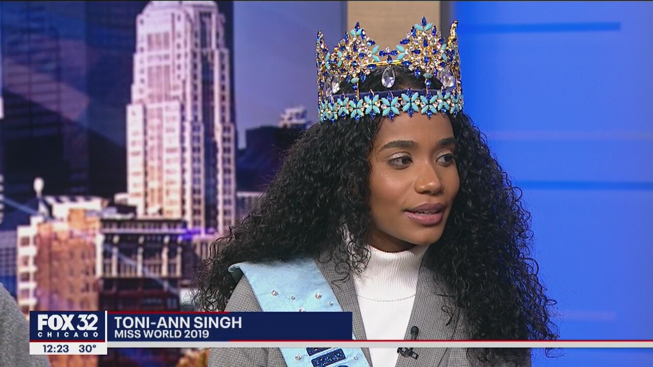 Toni-Ann Singh, Miss World 2019, joins the set along with Miss World CEO Julie Morley.