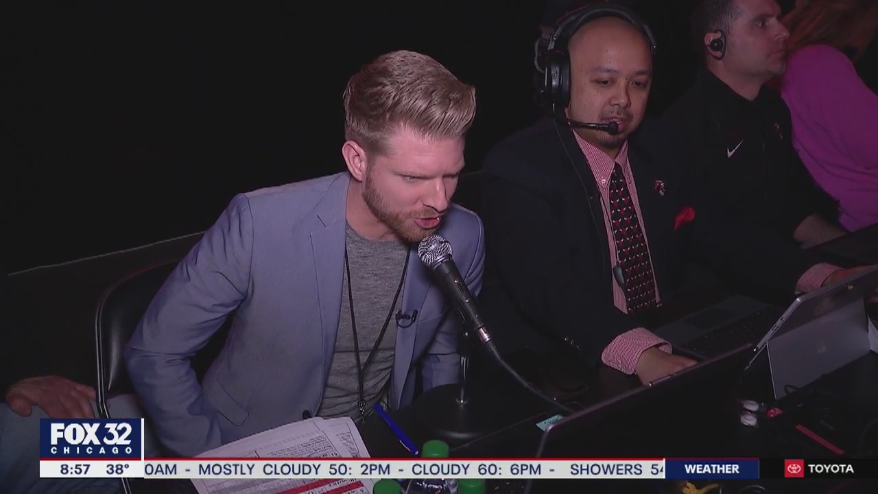 FOX 32's Jake Hamilton tests his skills behind the PA system of the Windy City Bulls.