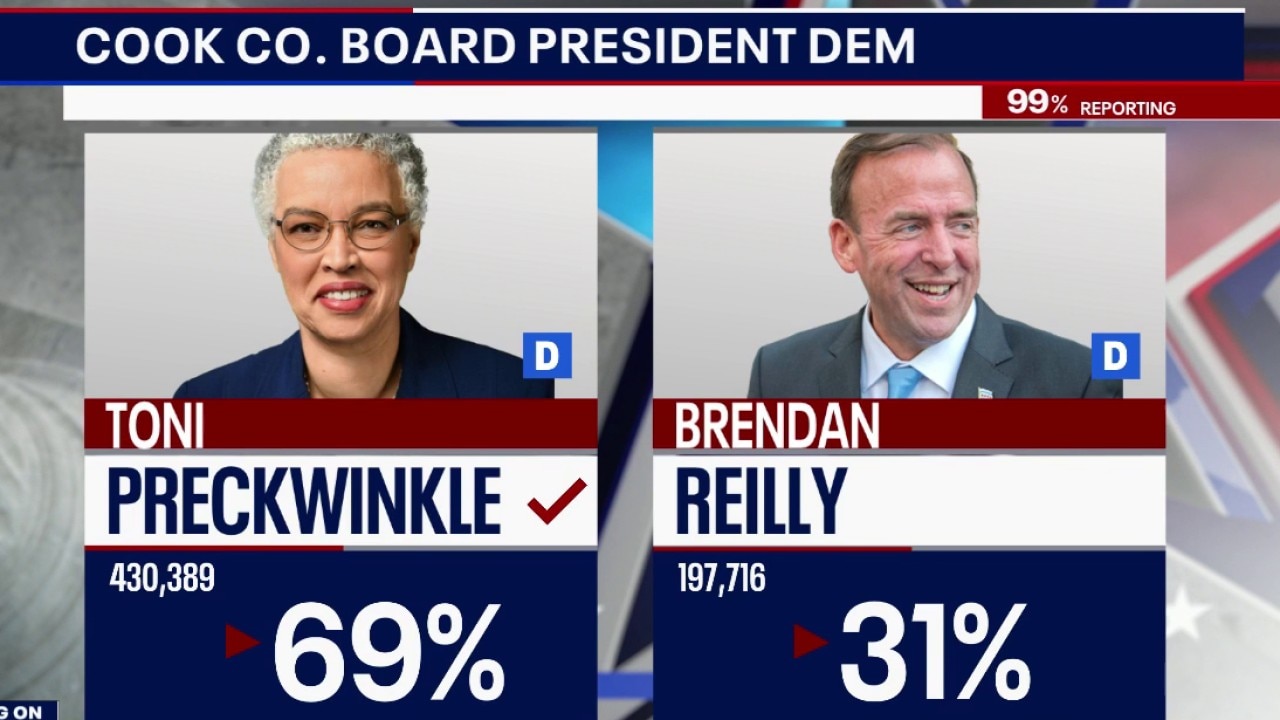 Toni Preckwinkle is projected to win the Democratic nomination for Cook County Board president, fending off a primary challenge from Chicago Ald. Brendan Reilly, the AP projects.