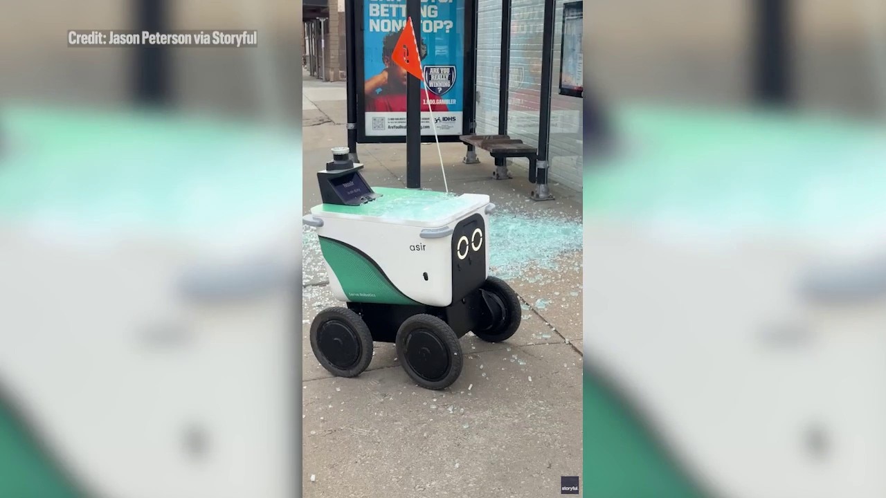 Chicago delivery robot after shattering glass at CTA bus shelter: VIDEO