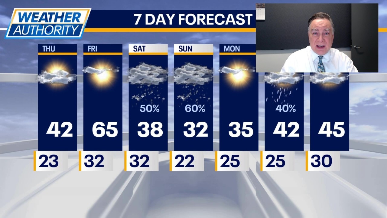 Unfortunately, the warmth is not here for long. In fact, there are two separate opportunities for snowfall in our area over the weekend. The first arrives Saturday and would favor our northern tier of counties for a light accumulation of an inch or so. Skies will be mostly cloudy with high temperatures in the mid to upper 30s.