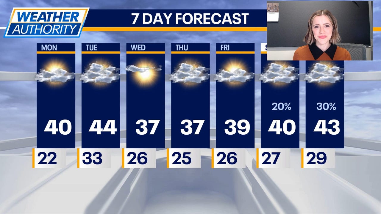 Mid-week will be a touch cooler with mostly sunny skies and highs in the upper 30s on Wednesday.