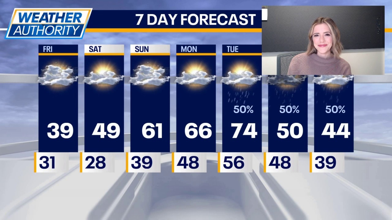 Highs on Tuesday will be in the mid 70s! We drop on Wednesday with highs around 50 under mostly cloudy skies. Thursday will be mostly cloudy with highs in the mid 40s.