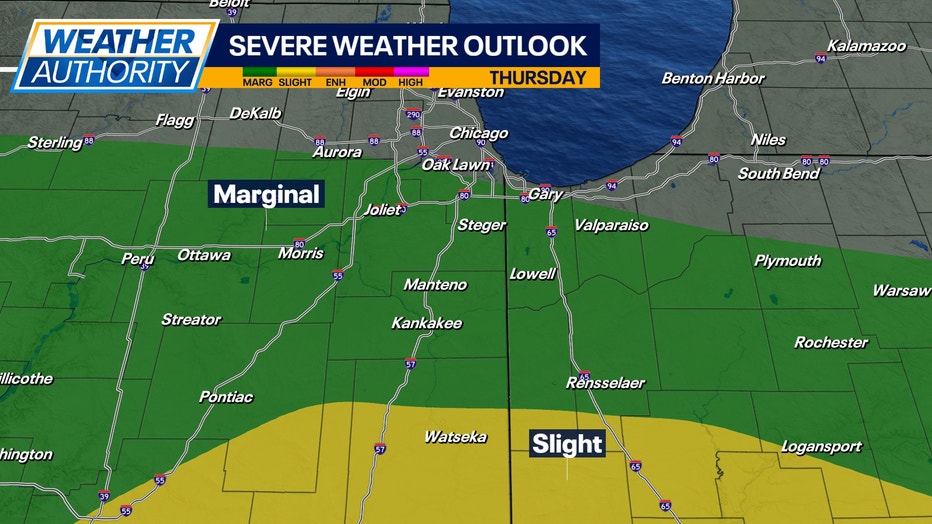 The Storm Prediction Center has areas south of I-88 in northeast Illinois and south of I-80 in northwest Indiana in a Marginal Risk for severe storms on Thursday. This is a level 1 of 5 on their severe risk scale. The threat then jumps to a Slight Risk (level 2 of 5) in southern Newton and Jasper Counties.