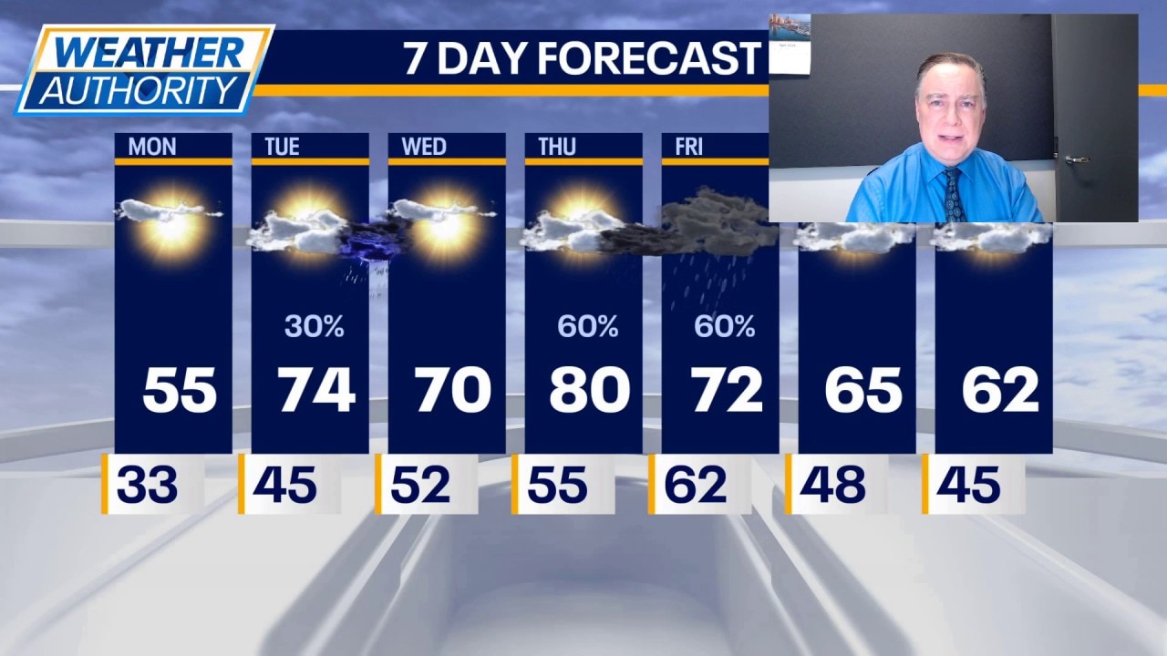 Highs on Friday will not be as warm — likely topping out closer to 70°. The weekend looks dry both days with a mixture of clouds and sun and high temperatures in the low to mid 60s.