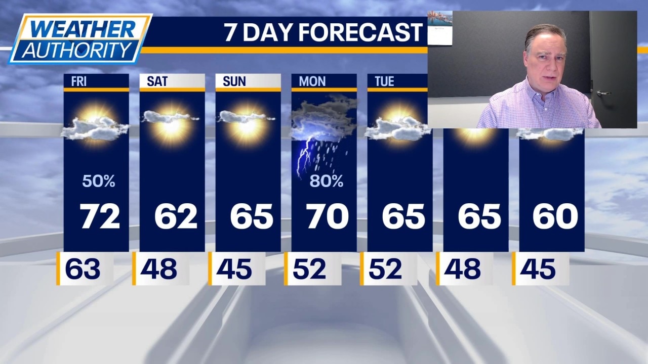 The next storm system arrives on Monday and that one may have more punch to it. That means the risk of heavier rainfall and perhaps severe storms. There’s plenty of time to fine-tune that one.
