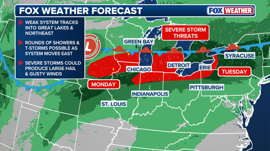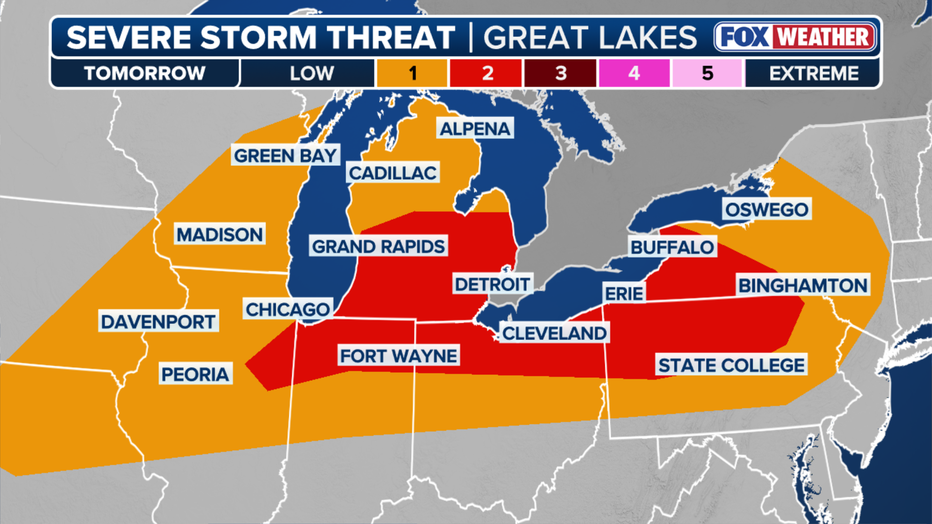 FOX Weather reports this system is part of a larger storm pattern impacting more than 25 million people across the Great Lakes, with the Storm Prediction Center placing much of the Chicago area under a Level 2 out of 5 risk for severe weather.