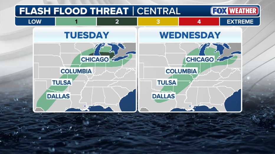 A Level 1 out of 4 risk of flash flooding covers that same corridor from Texas to Michigan.