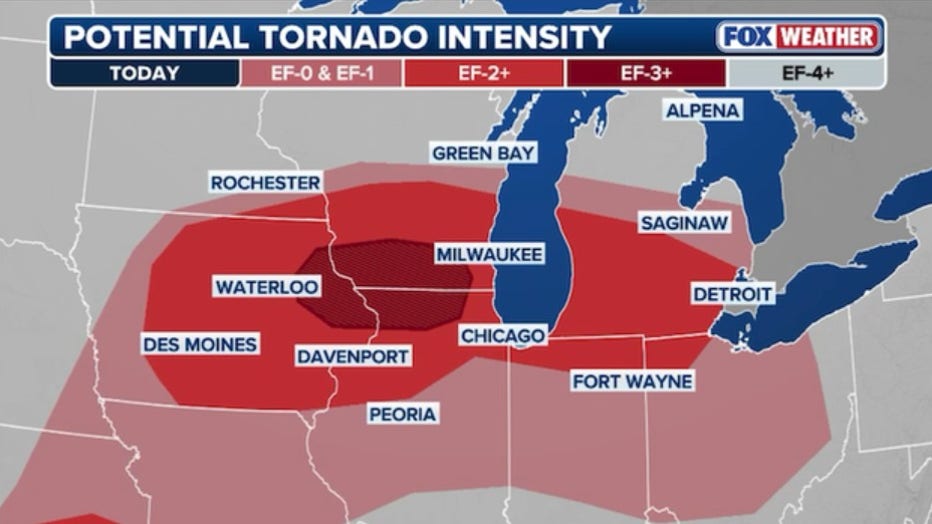 The greatest potential for intense tornadoes today is concentrated along a corridor stretching across eastern Iowa, northern Illinois, and southern Wisconsin.
