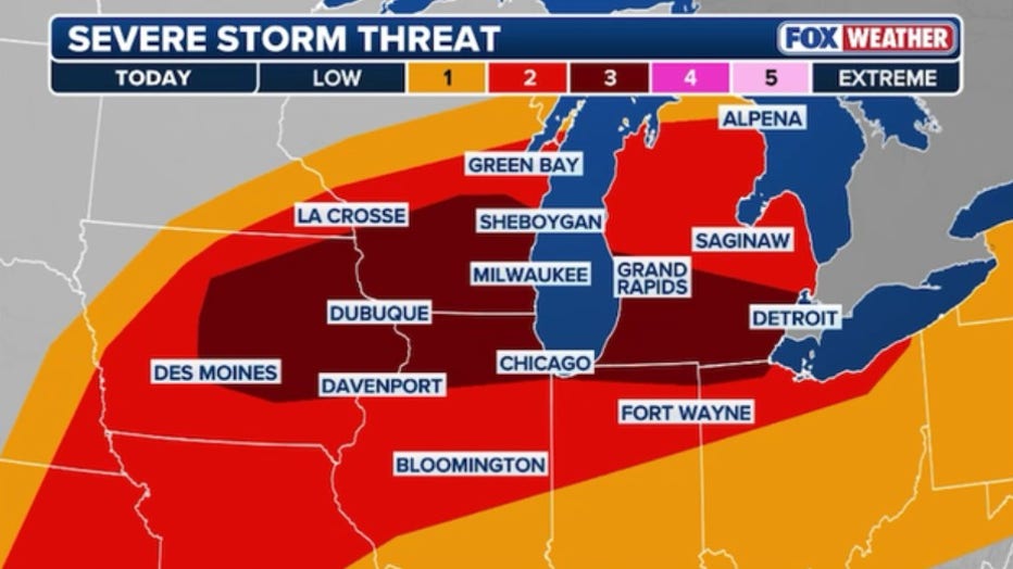 The severe weather threat has expanded for Tuesday. A Level 3 out of 5 severe storm risk is in effect across parts of Iowa, Wisconsin, Illinois, Indiana and Michigan, including Chicago and Milwaukee.
