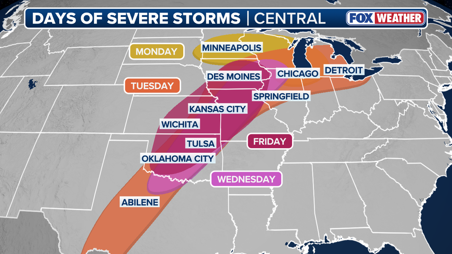 Storms are expected to shift toward the Mississippi River Valleys, with the possibility for damaging wind gusts, hail and tornadoes primarily across a corridor that includes Oklahoma, eastern Kansas, western Missouri, eastern Iowa, western Illinois and parts of southern Wisconsin.