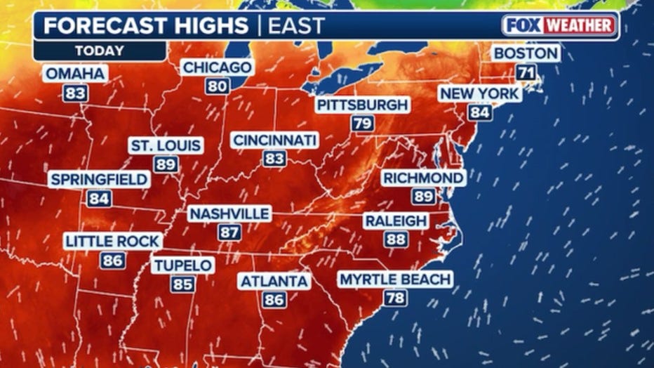 Forecast high temperatures for Tuesday across the eastern half of the United States.