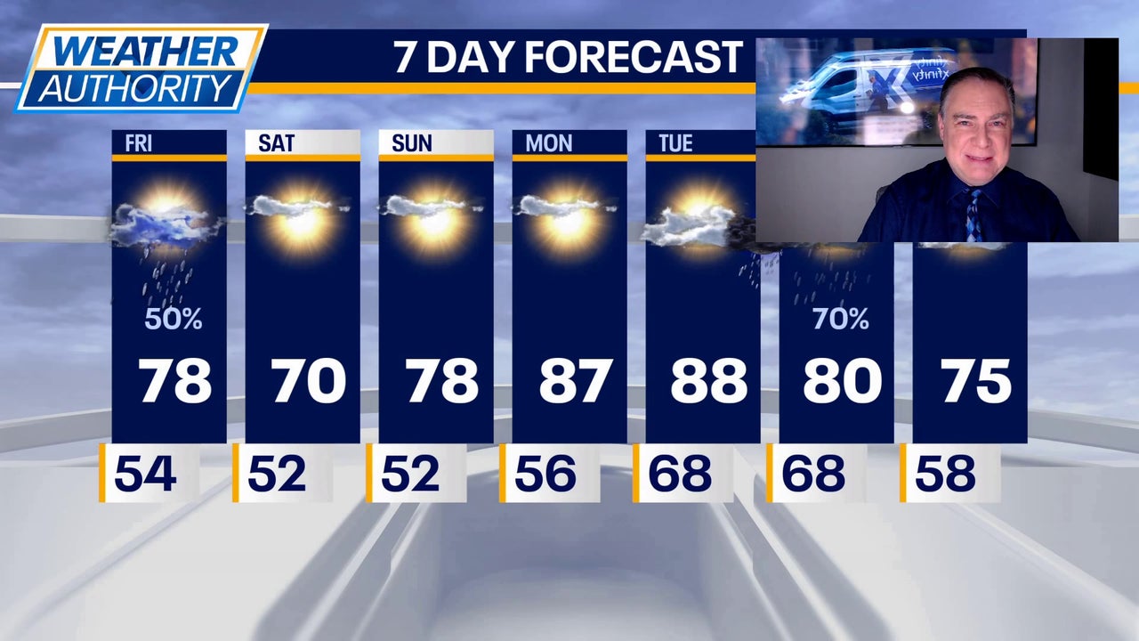 All signs continue to point to a big warm-up next week with highs well into the 80s starting Monday. The next chance of showers and thunderstorms would arrive late Tuesday night and Wednesday.