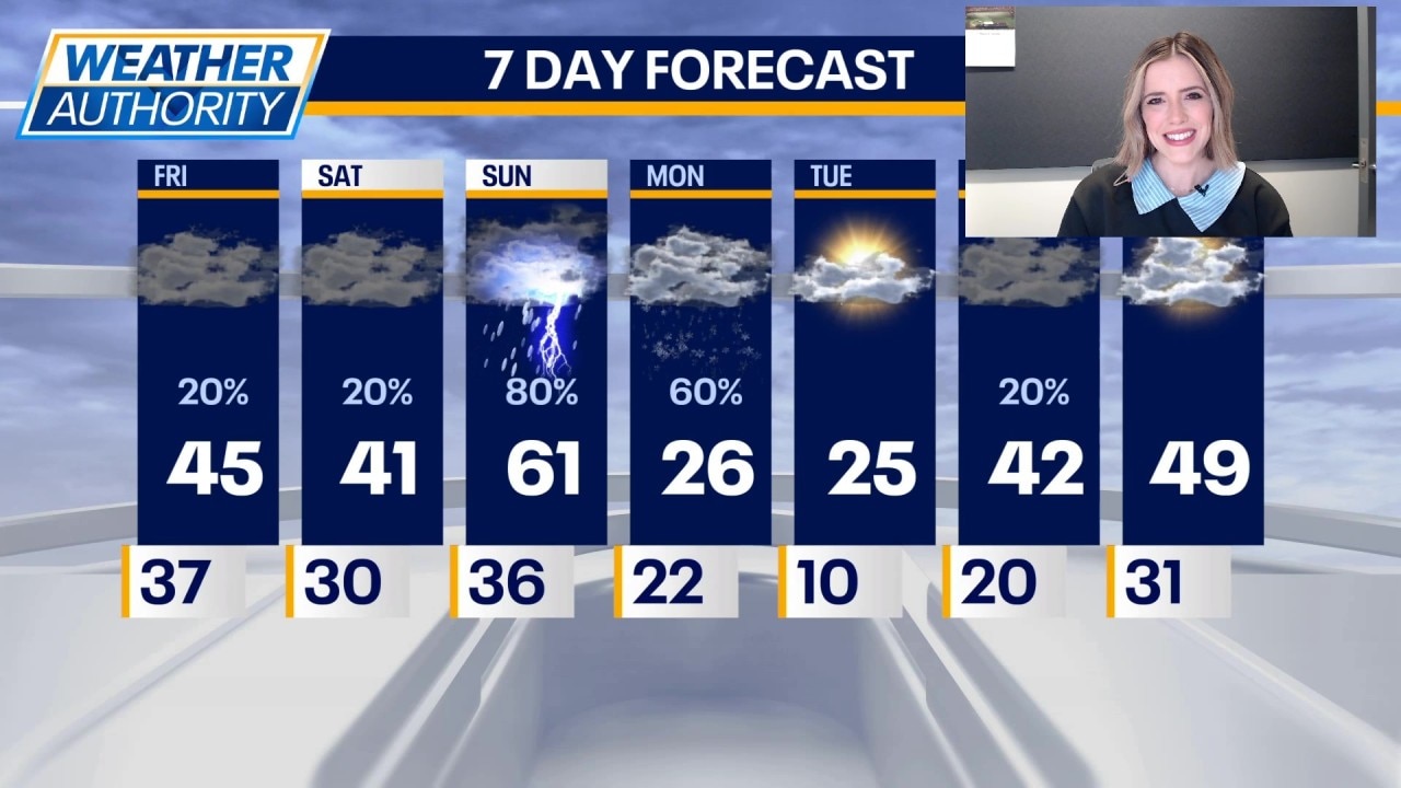 Tomorrow, we have the chance for snow early. Highs will only be in the low 40s with cloudy skies. There is another chance for snow/rain Saturday night into Sunday morning. On Sunday there is a chance for storms with strong wind. Highs on Sunday will be pushing into the low 60s.