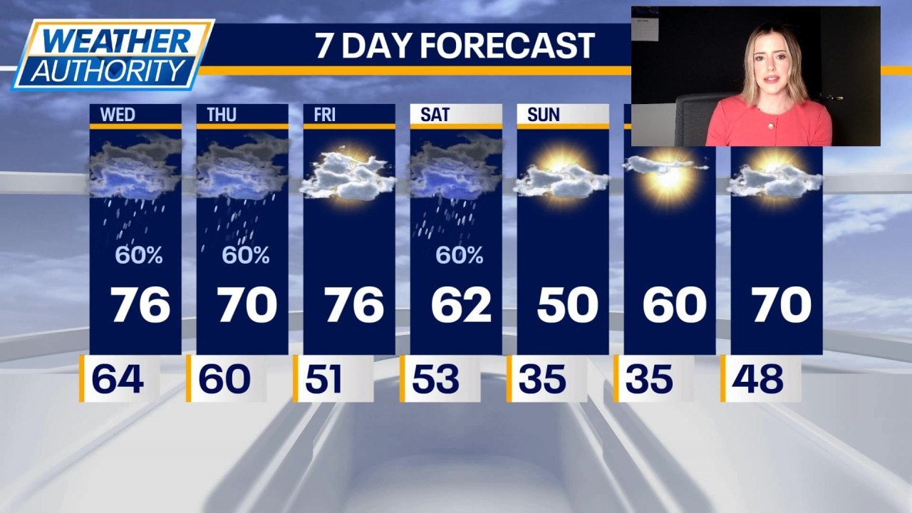 The weekend turns cooler, with highs near the low 60s Saturday and around 50 degrees Sunday under mostly sunny skies. Early next week brings a rebound, with temperatures climbing back into the 60s Monday and near 70 by Tuesday.
