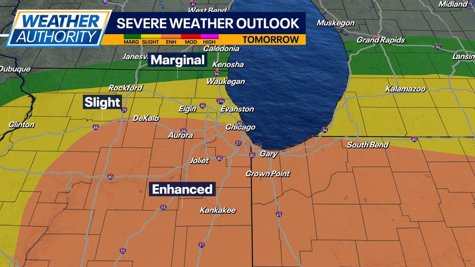 The Storm Prediction Center has upgraded areas along and south of I-88 to an Enhanced Risk, which is a level 3 of 5. Areas north of I-88 are now in a level 2 Slight Risk. The timeframe to watch will be from roughly 3 PM to 9 PM on Thursday.