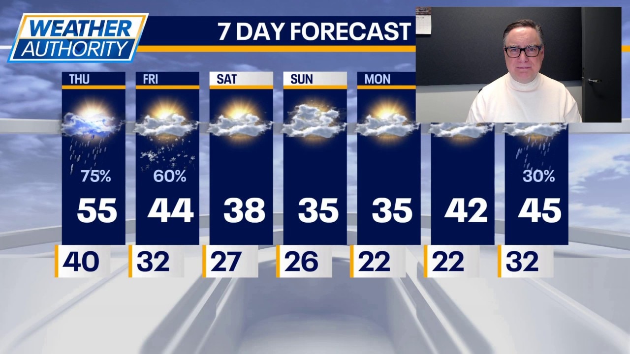 That colder regime will last through the weekend and into Monday, when skies will be partly to mostly cloudy with highs in the 30s and lows in the 20s.