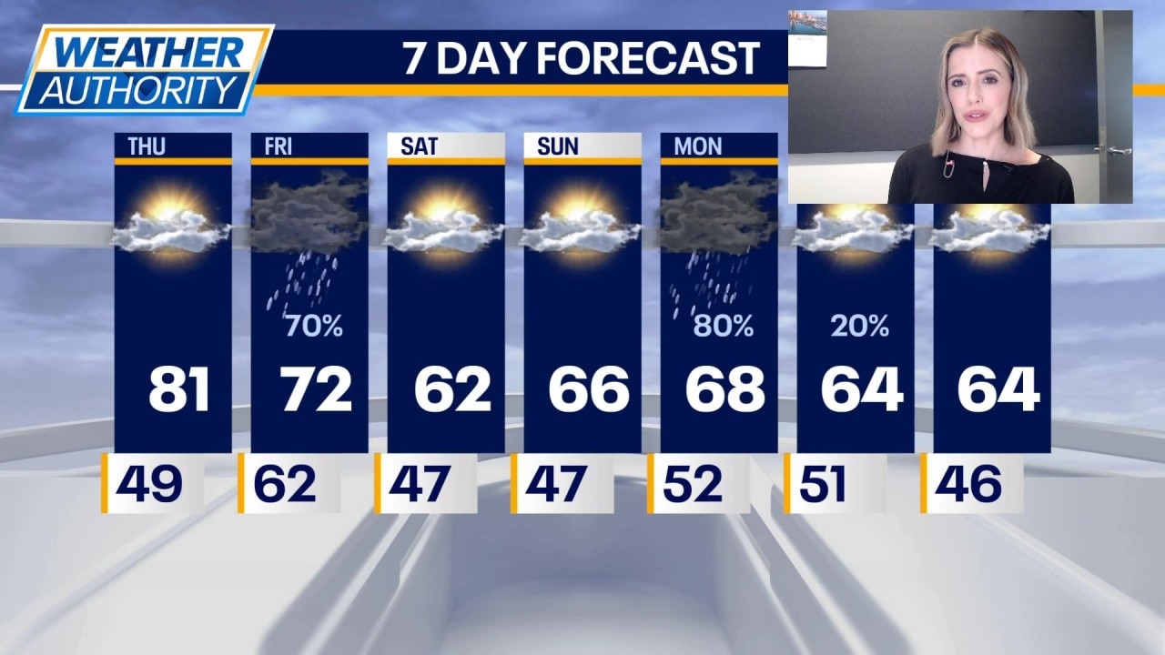 Friday will be mostly cloudy with highs in the low 70s. As mentioned above, there will be a chance for rain but also dry time too. This weekend things will clear out, but temperatures will be cooler.