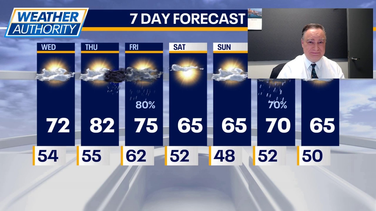 The next chance of rain arrives by Monday morning with highs in the upper 60s. That will be tied to a cold front impacting high temperatures on Tuesday, which will only be in the low 60s.