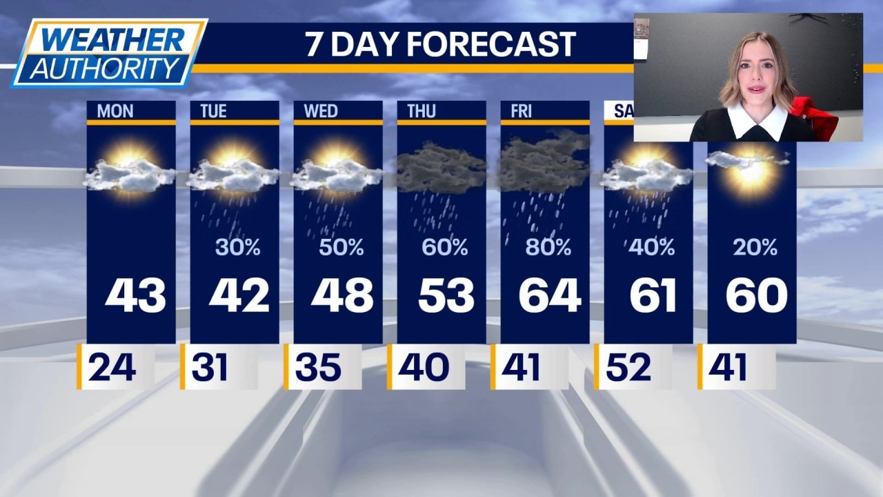We are going to have a wet week ahead, with rain chances each day into this weekend. Tuesday will be mostly cloudy with highs in the low 40s. Wednesday will be mostly cloudy again with highs in the upper 40s. The best chance for rain leans south of Chicago on Tuesday and Wednesday.