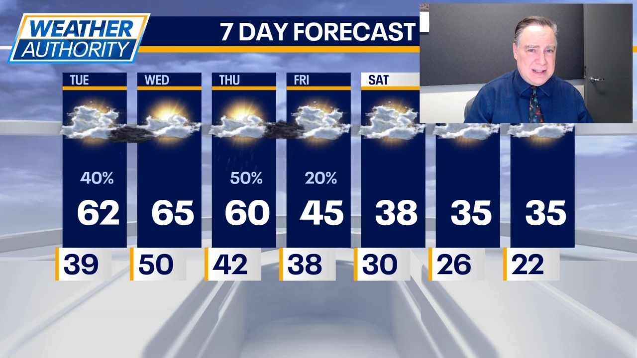 The rest of the day will be mostly cloudy and not as warm with high in the mid 40s. Colder air will be in place over the weekend with partly to mostly cloudy skies and highs in the 30s.
