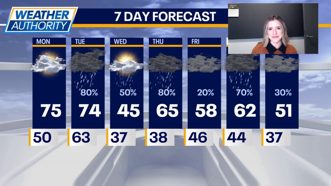 Tuesday will be another fantastically warm day! Highs in the afternoon will be in the mid 70s. There is a chance for storms again with a cold front. All hazards will be at play in the afternoon and evening.