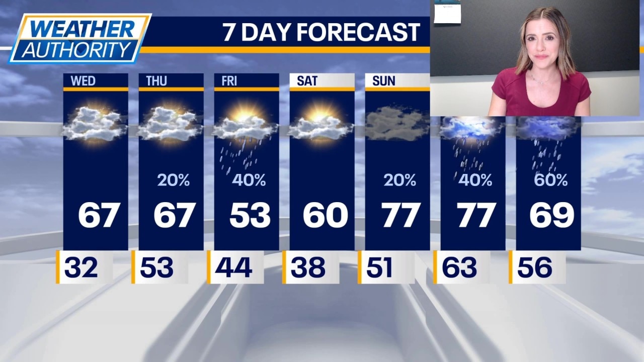 Thursday will be mostly sunny with highs in the upper 60s again! The chance for rain and storms ramps back up Thursday night into early Friday.