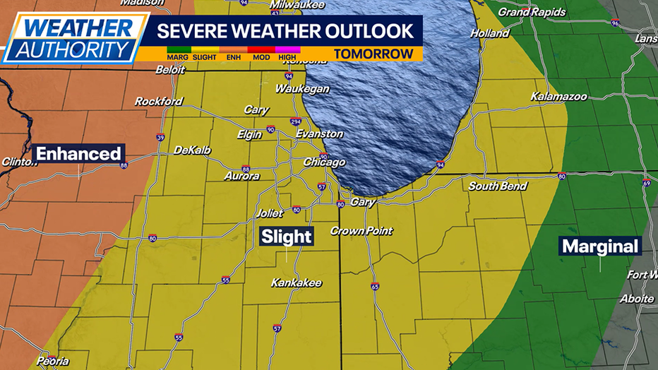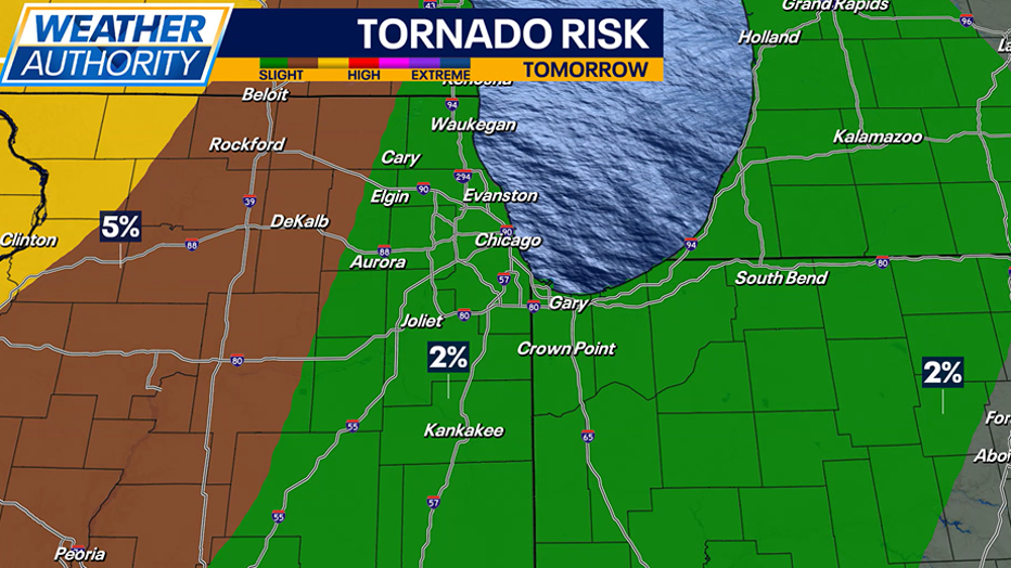 The primary concern with any storms that become severe will be damaging wind gusts, but we'll also need to watch for large hail and a few isolated tornadoes. The overall tornado threat appears highest west of Chicagoland, but our region is still highlighted in a 2-5% risk.