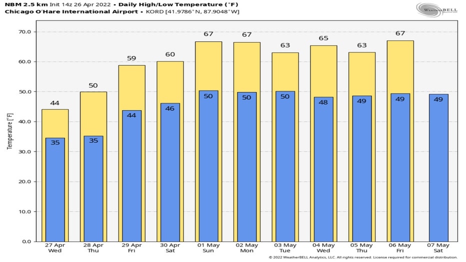 The GFS model has lows early Wednesday morning dropping into the upper 20s for our far northern and northwestern suburbs. Lows could dip to near 30 degrees well west of the city. From the city on southward, the model has lows in the middle 30s.