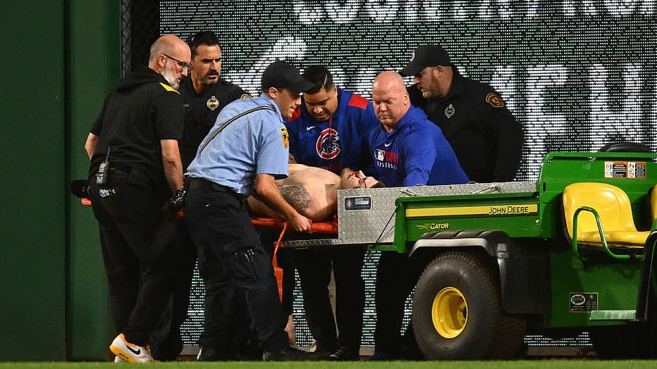 PITTSBURGH, PENNSYLVANIA - APRIL 30: A fan is carted off the field after falling from the stands during the seventh inning of the game between the Chicago Cubs and the Pittsburgh Pirates at PNC Park on April 30, 2025 in Pittsburgh, Pennsylvania. (Pho